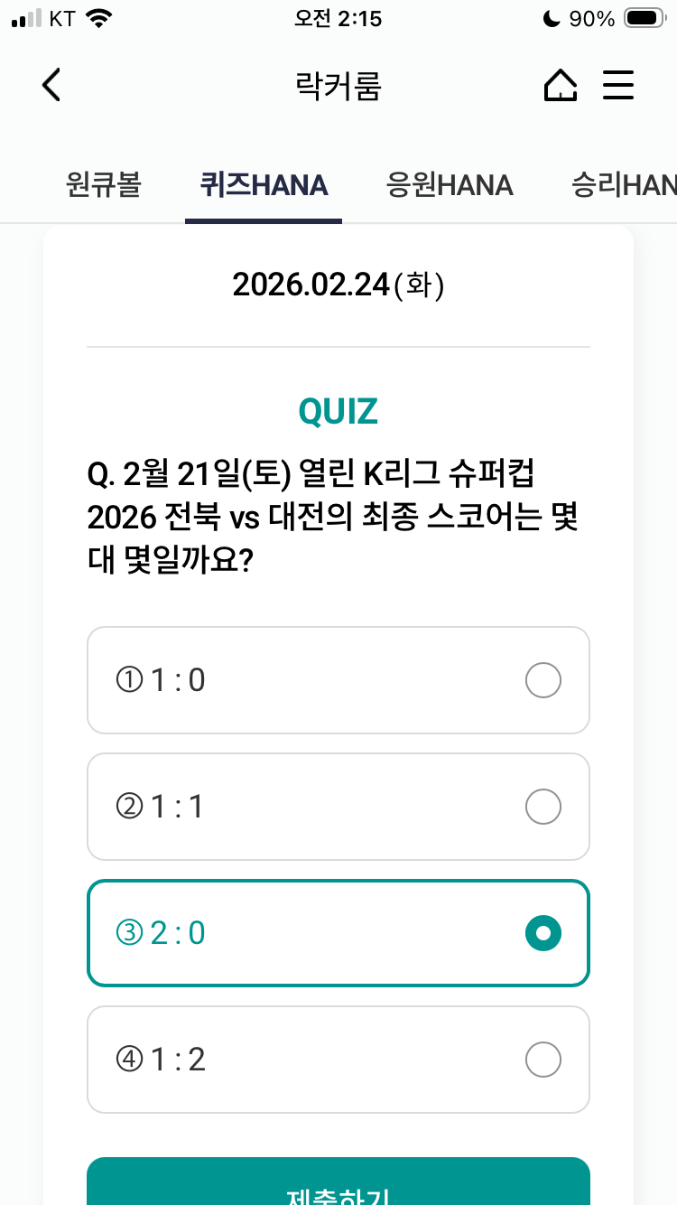 하나원큐퀴즈 2월 24일 축구 문제 정답 2월 21일 (토) 열린 k리그 슈퍼컵 2026 전북 VS 대전의 최종 스코어는 몇대 몇일까요?
