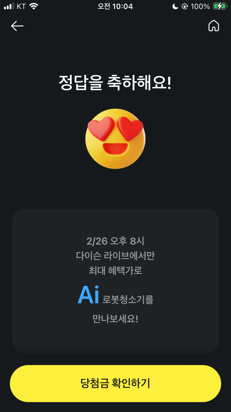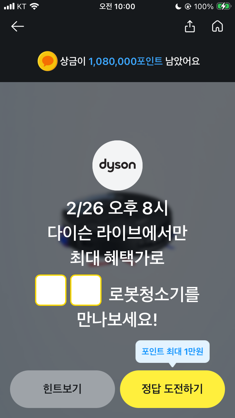 카카오페이 퀴즈 2월 26일 퀴즈타임 문제 정답 2/26 오후 8시 다이슨 라이브에서만 최대 혜택가로 00 로봇청소기를 만나보세요!