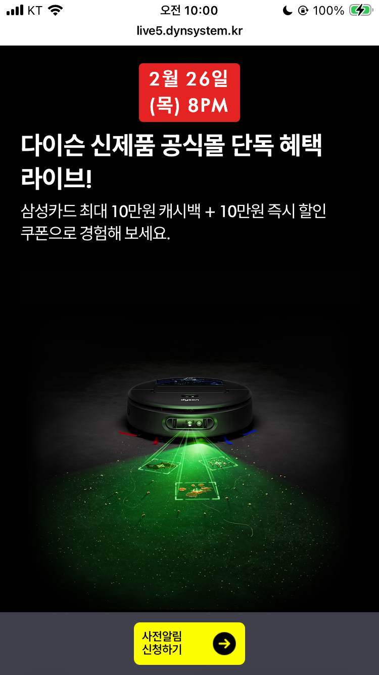 2/26 오후 8시 다이슨 라이브에서만 최대 혜택가로 00 로봇청소기를 만나보세요!