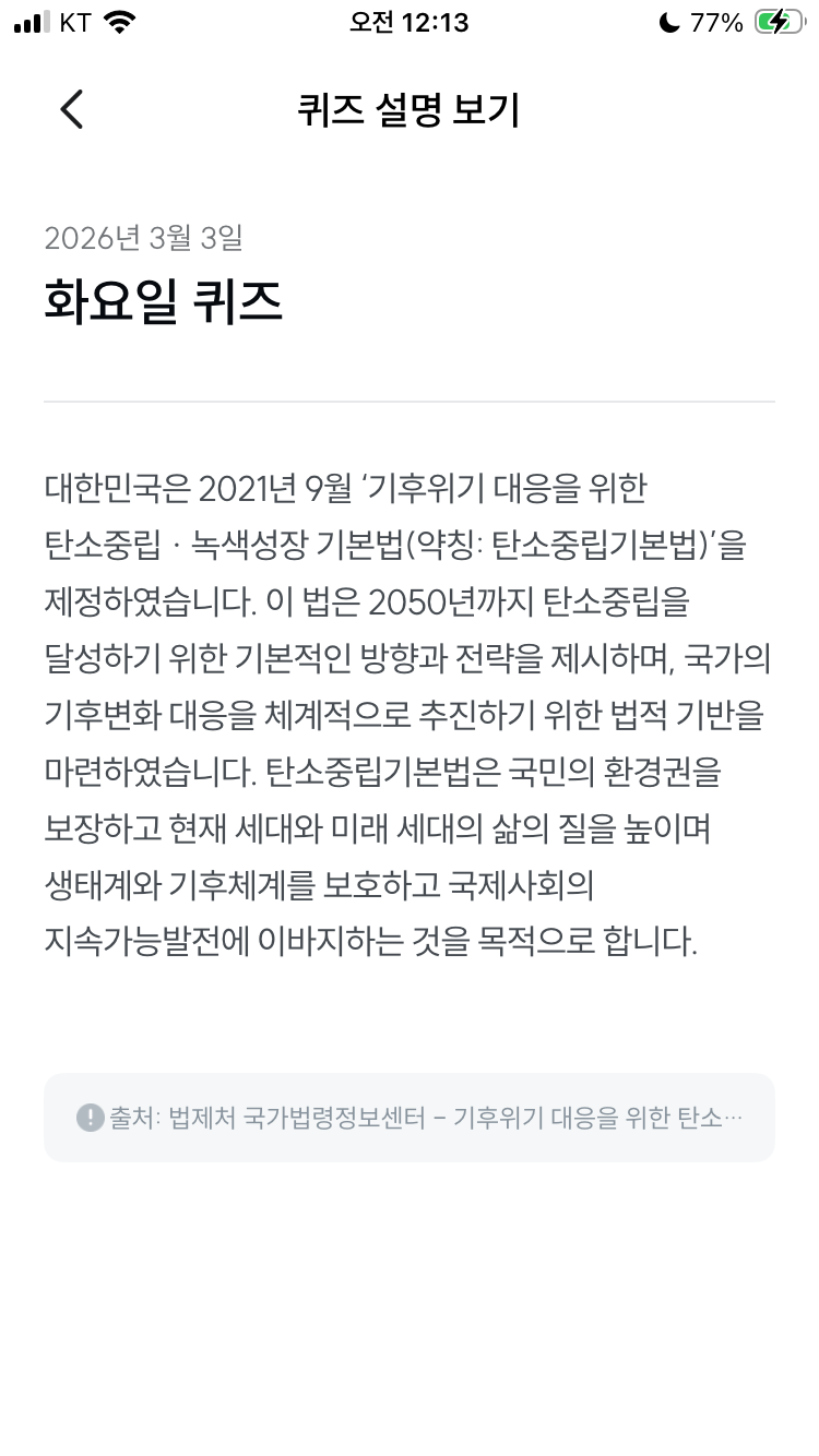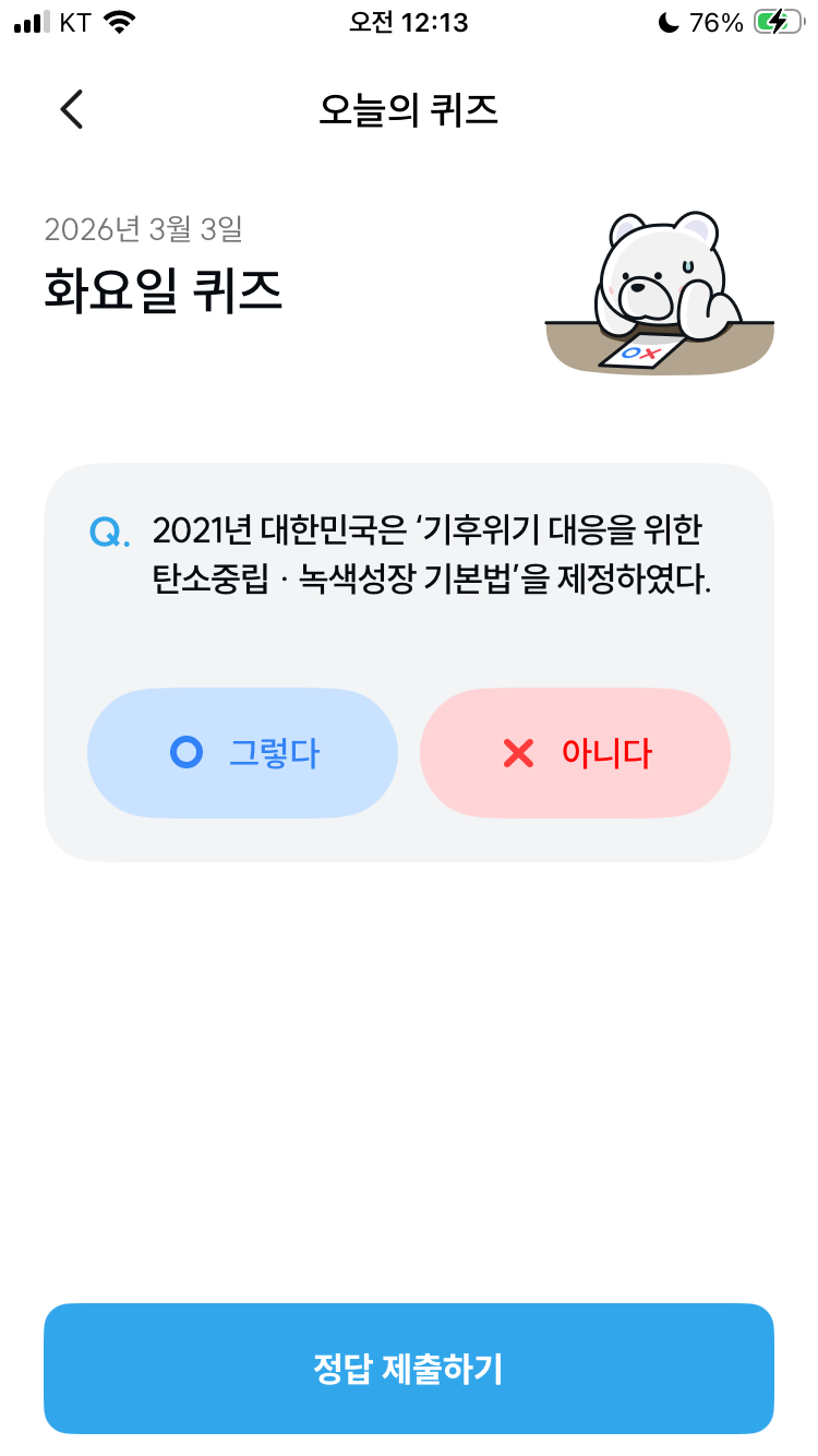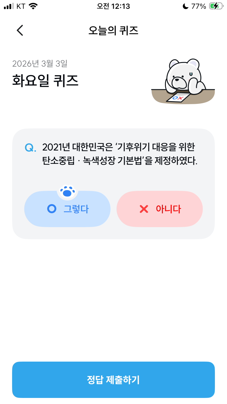 기후동행퀴즈 3월 3일 오늘의 기후행동 퀴즈 정답 문제 2021년 대한민국은 기후위기 대응을 위한 탄소중립 녹색성장 기본법을 제정하였다.