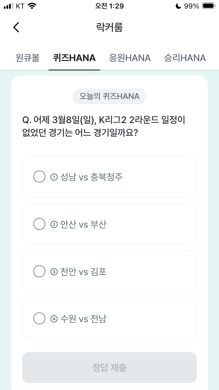 하나원큐퀴즈 3월 9일 축구 문제 정답 어제 3월 8일(일), K리그2 2라운드 일정이 없었던 경기는 어느 경기일까요? (K리그1, K리그2 2라운드 경기 결과 순위 정리)