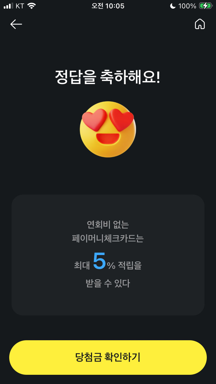 카카오페이 퀴즈 3월 10일 퀴즈타임 문제 정답 연회비 없는 페이머니체크카드는 최대 0% 적립을 받을 수 있다.