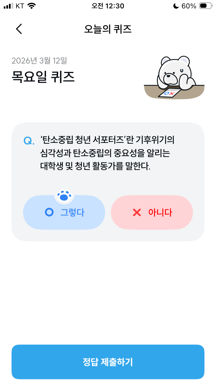 기후동행퀴즈 3월 12일 오늘의 기후행동 퀴즈 정답 문제 탄소중립 청년 서포터즈'란 기후위기의 심각성과 탄소중립의 중요성을 알리는 대학생 및 청년 활동가를 말한다. (+ 탄소중립 뜻)