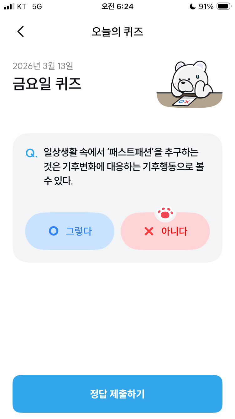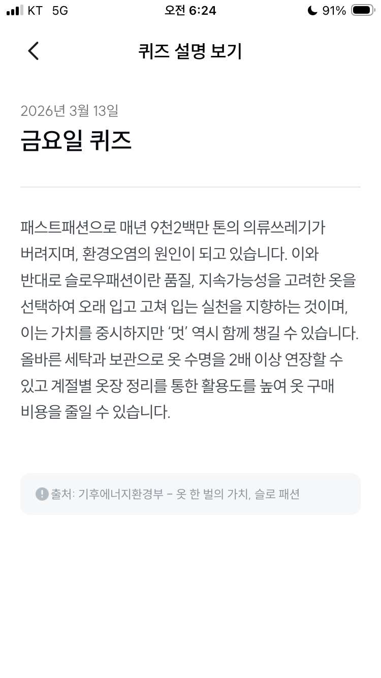 기후동행퀴즈 3월 13일 오늘의 기후행동 퀴즈 정답 문제 패스트패션 뜻 환경문제 해결방안 문제점 단점 영향 (vs 슬로우패션)