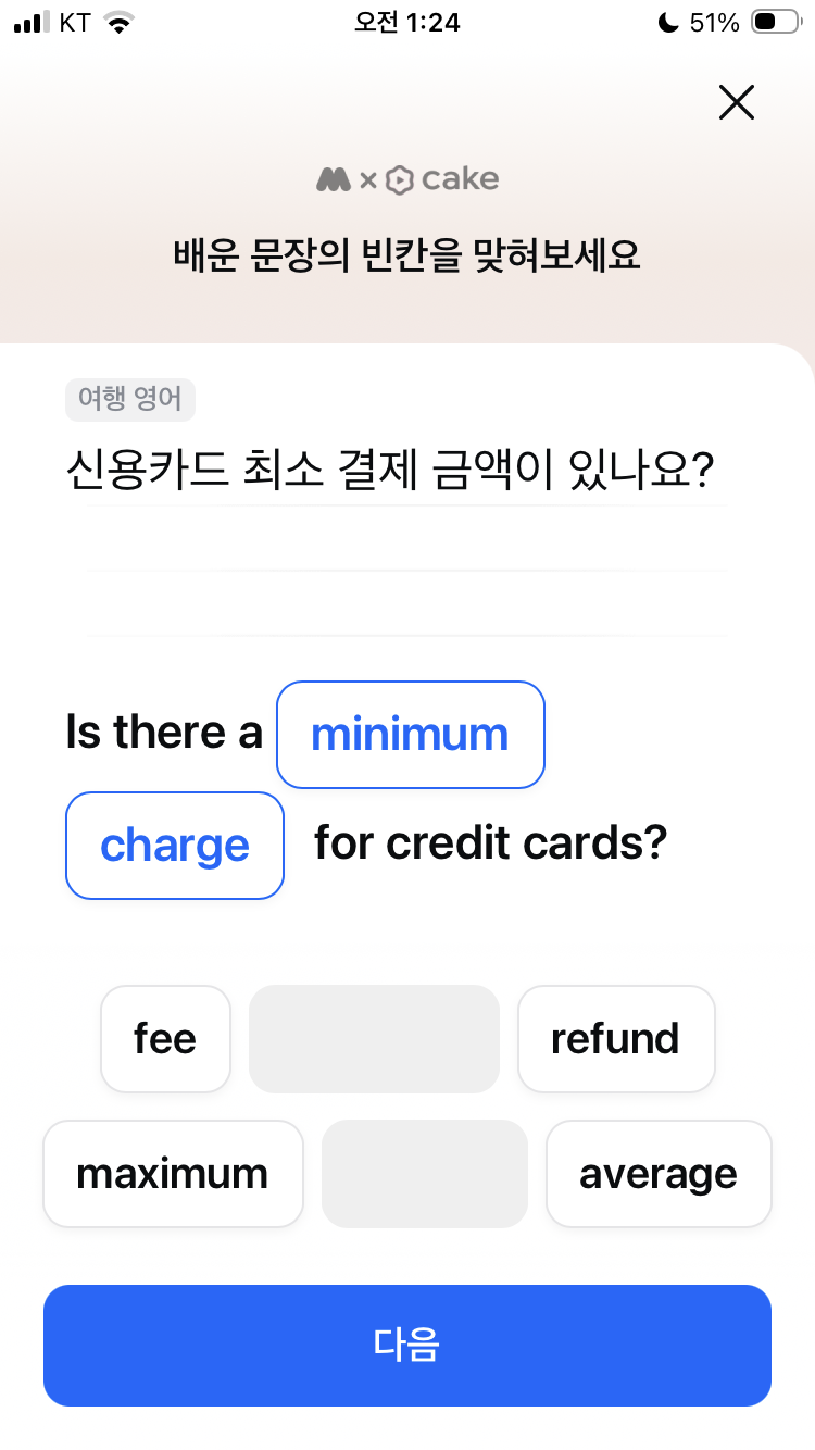 모니모 오늘의 영어공부 3월 14일 여행 영어퀴즈 문제 정답 카드 되나요? take accept credit cards? 최소 결제 금액 minimum charge