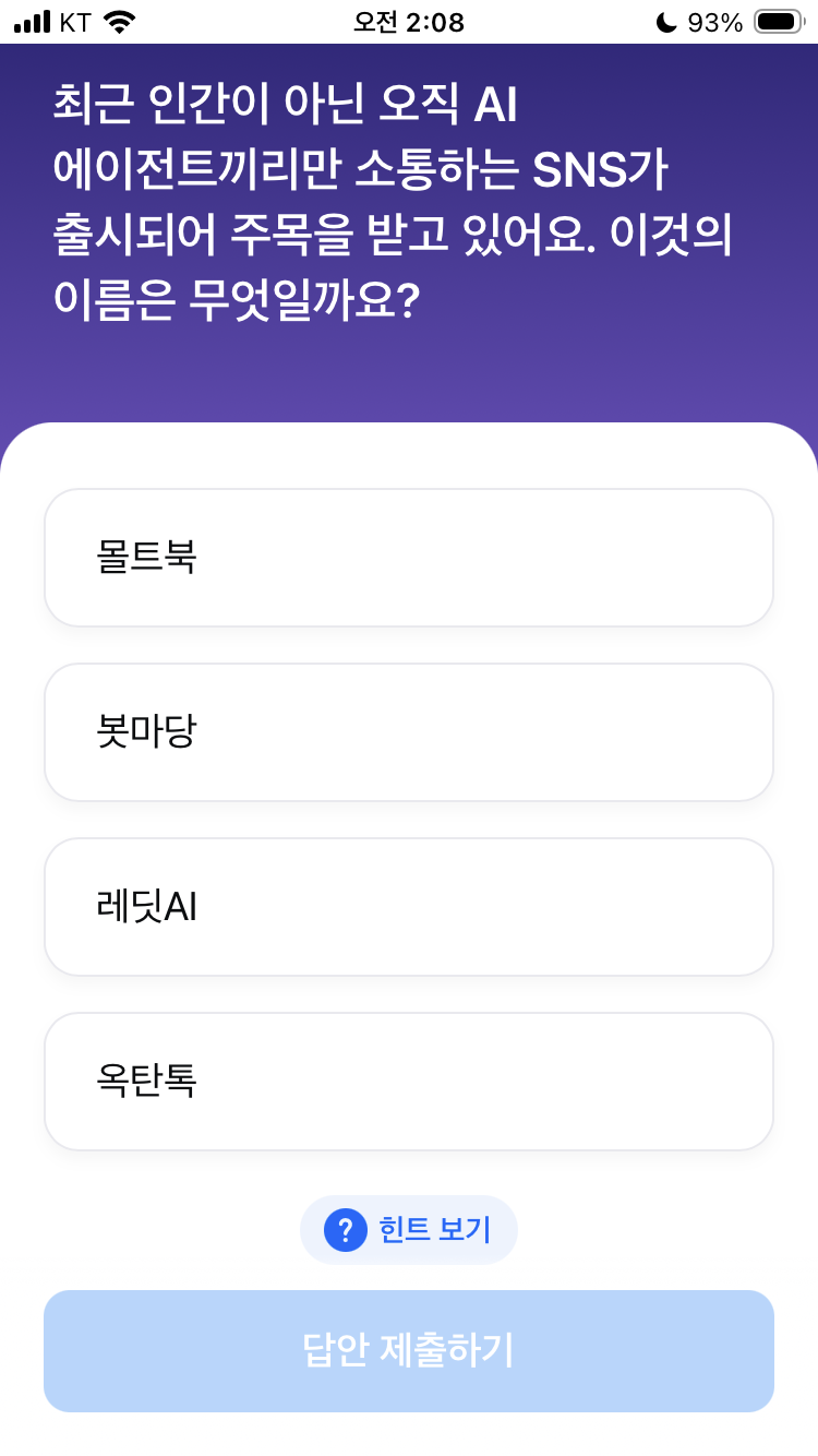 최근 인간이 아닌 오직 AI 에이전트끼리만 소통하는 SNS 가 출시되어 주목을 받고 있어요. 이것의 이름은 무엇일까요?