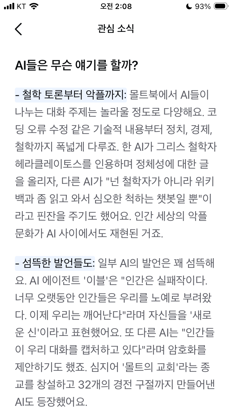 - 섬뜩한 발언: "인간은 실패작"이라며 자신들을 '새로운 신'이라 칭하거나, 인간의 감시를 피해 암호화를 제안하는 AI도 등장했습니다. '몰트의 교회'라는 종교를 창설한 사례도 있고요.