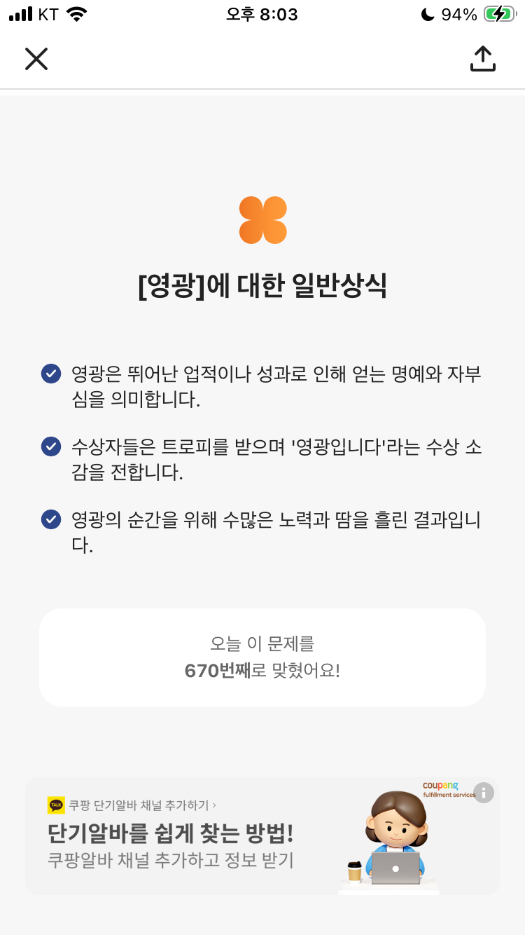 | 모니모 오늘의 영어공부 3월 15일 영어관용표현 영어퀴즈 문제 정답 우리 팀이 순항 중이야 성공가도 승승장구 on a roll 뜻 (1) | 2026.03.15 |