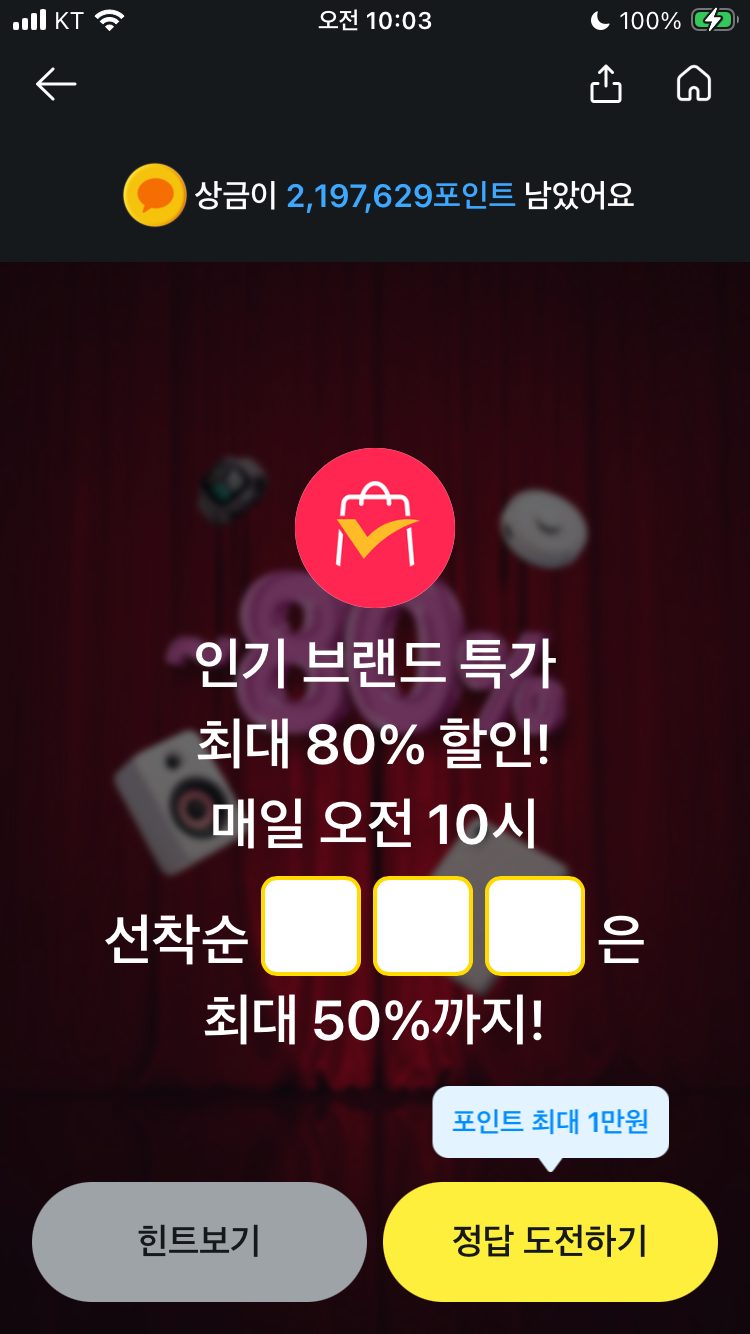 카카오페이 퀴즈 3월 16일 퀴즈타임 문제 정답 알리 인기 브랜드 특가 최대 80% 할인! 매일 오전 10시 선착순 000은 최대 50%까지!