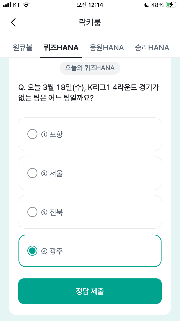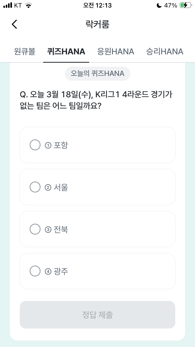 하나원큐퀴즈 3월 18일 축구 문제 정답 오늘 3월 18일 (수), K리그1 4라운드 경기가 없는 팀은 어느 팀일까요?