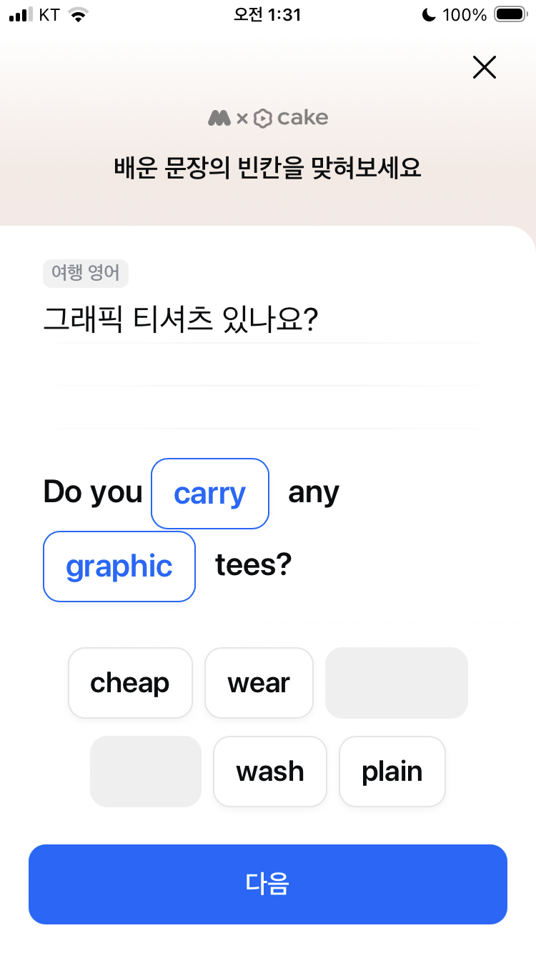 모니모 오늘의 영어공부 3월 19일 여행 영어퀴즈 문제 정답 티셔츠 좀 보려고요 looking for, in search of, carry any graphic tees