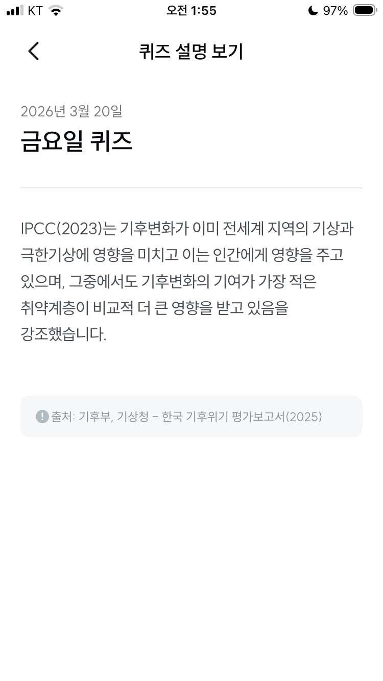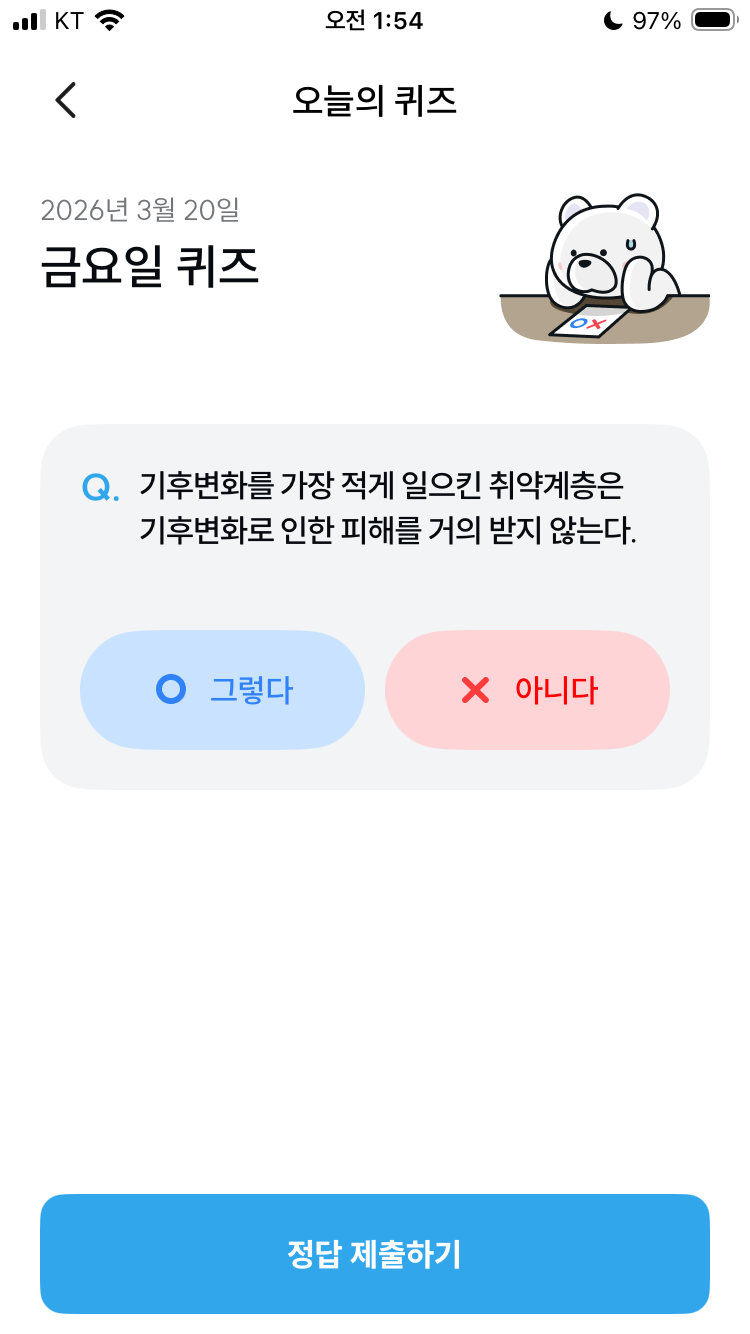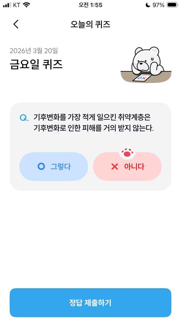 기후동행퀴즈 3월 20일 오늘의 기후행동 퀴즈 정답 문제 기후변화를 가장 적게 일으킨 취약계층은 기후변화로 인한 피해를 거의 받지 않는다. (+ 기후 취약계층)