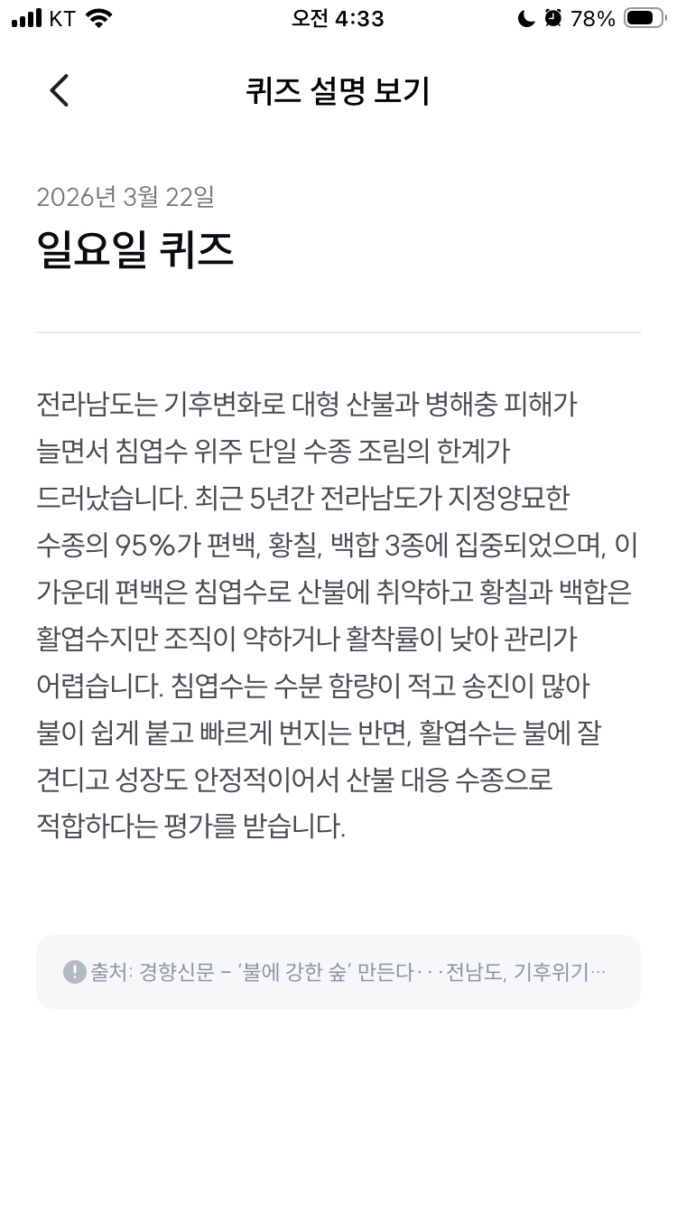 침엽수는 목재로서의 가치가 높고 사계절 푸른 경관을 주지만, 기후 위기로 인한 대형 산불에는 취약할 수 있어요. 그래서 최근에는 퀴즈 설명처럼 활엽수를 적절히 섞어 심는 '혼효림' 조성이 중요해지고 있습니다.
