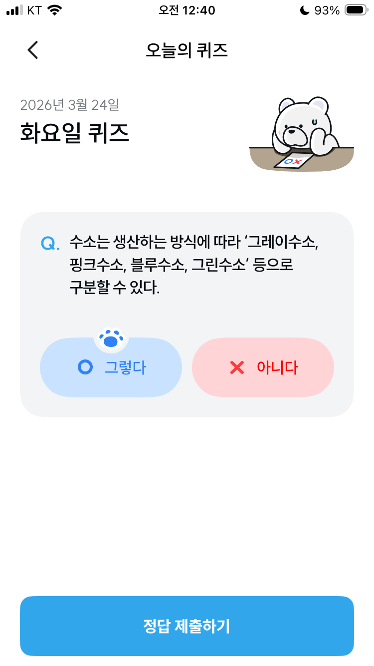 기후동행퀴즈 3월 24일 오늘의 기후행동 퀴즈 정답 문제 수소는 생산하는 방식에 따라 ‘그레이수소, 핑크수소, 블루수소, 그린수소’ 등으로 구분할 수 있다. (+ 뜻, 제조방법)