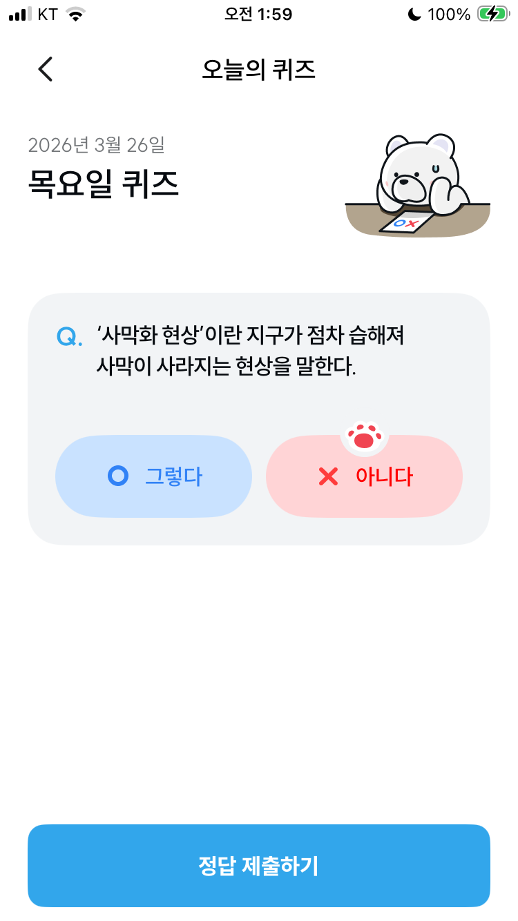 기후동행퀴즈 3월 26일 오늘의 기후행동 퀴즈 정답 문제 ‘사막화 현상’이란 지구가 점차 습해져 사막이 사라지는 현상을 말한다.