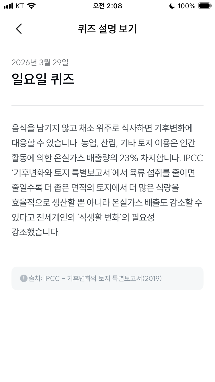 - 토지 이용의 효율성: 고기를 얻기 위해 가축을 기르려면 엄청난 면적의 땅과 사료용 곡물이 필요해요. 퀴즈 설명처럼 채식 위주의 식단을 선택하면 더 적은 땅에서 더 많은 사람이 먹을 수 있는 식량을 생산할 수 있고, 그만큼 산림 파괴를 줄일 수 있습니다.