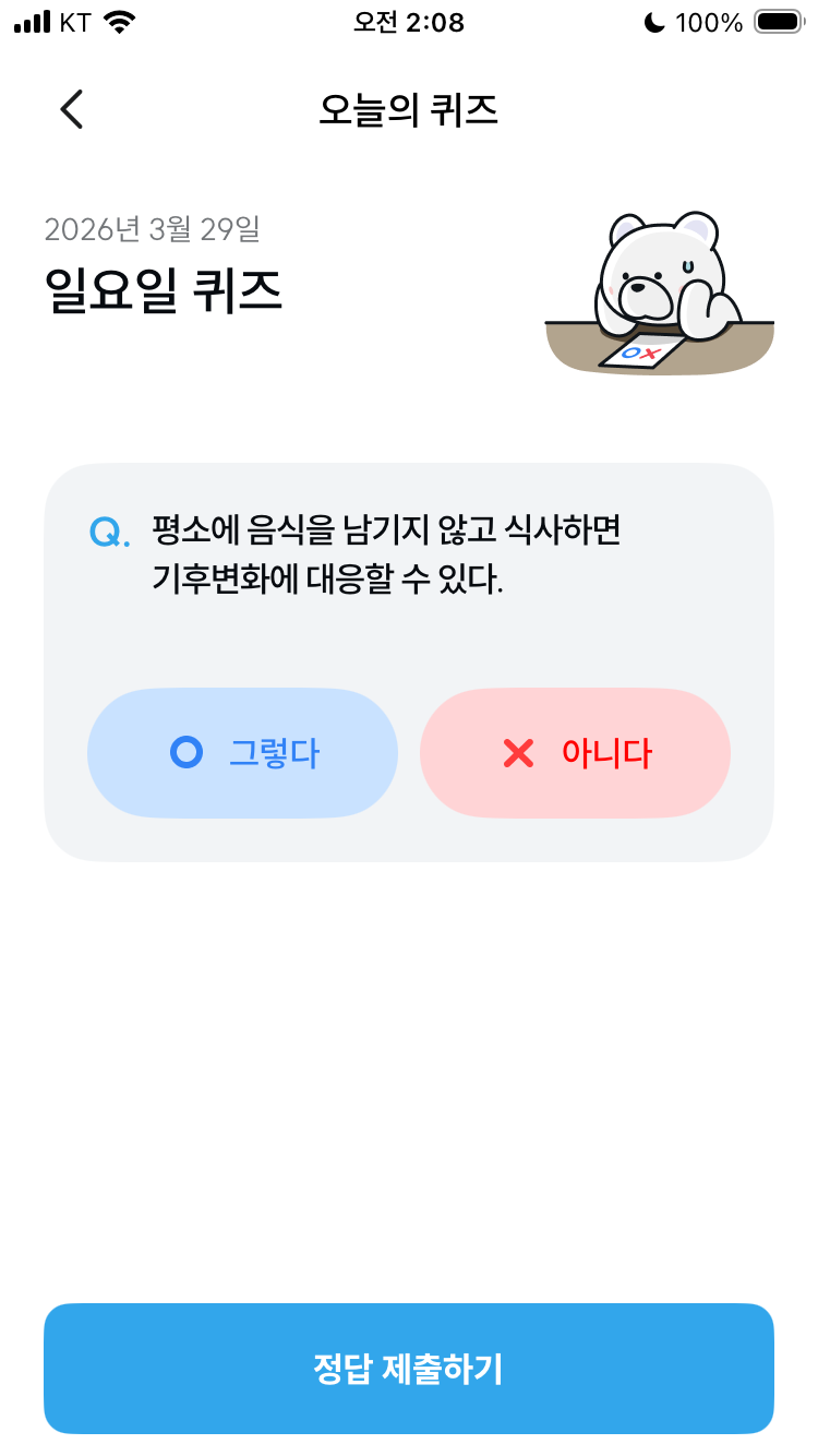 기후동행퀴즈 3월 29일 오늘의 기후행동 퀴즈 정답 문제 평소에 음식을 남기지 않고 식사하면 기후변화에 대응할 수 있다.