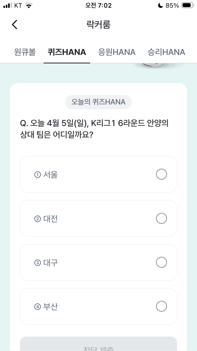 하나원큐퀴즈 4월 5일 축구 문제 정답 오늘 4월 5일(일), K리그1 6라운드 안양의 상대 팀은 어디일까요? (K리그1 6라운드 경기일정 및 현재 순위)