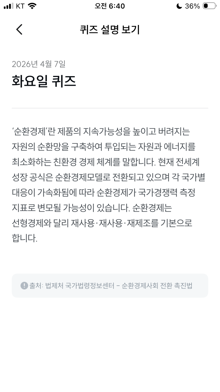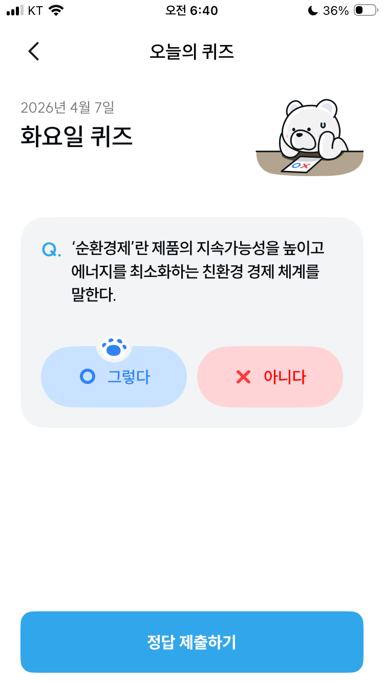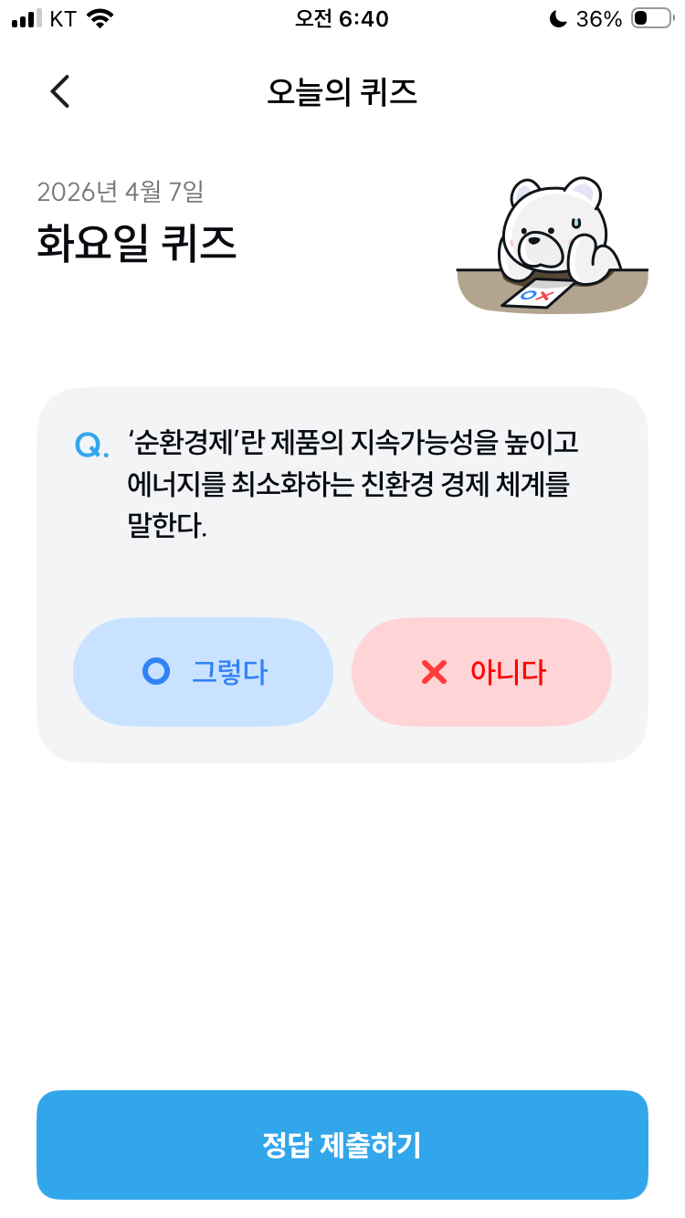 기후동행퀴즈 4월 7일 오늘의 기후행동 퀴즈 정답 문제 '순환경제'란 제품의 지속가능성을 높이고 에너지를 최소화하는 친환경 경제 체계를 말한다.