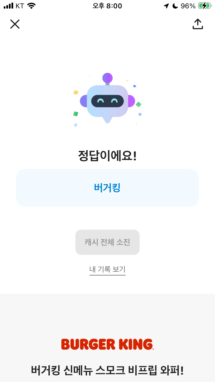 | 카카오뱅크 ai 이모지 퀴즈 04월 09일 카뱅 문제 정답 오전 8시 버거킹 신제품 버거의 이름은? (0) | 2026.04.09 |