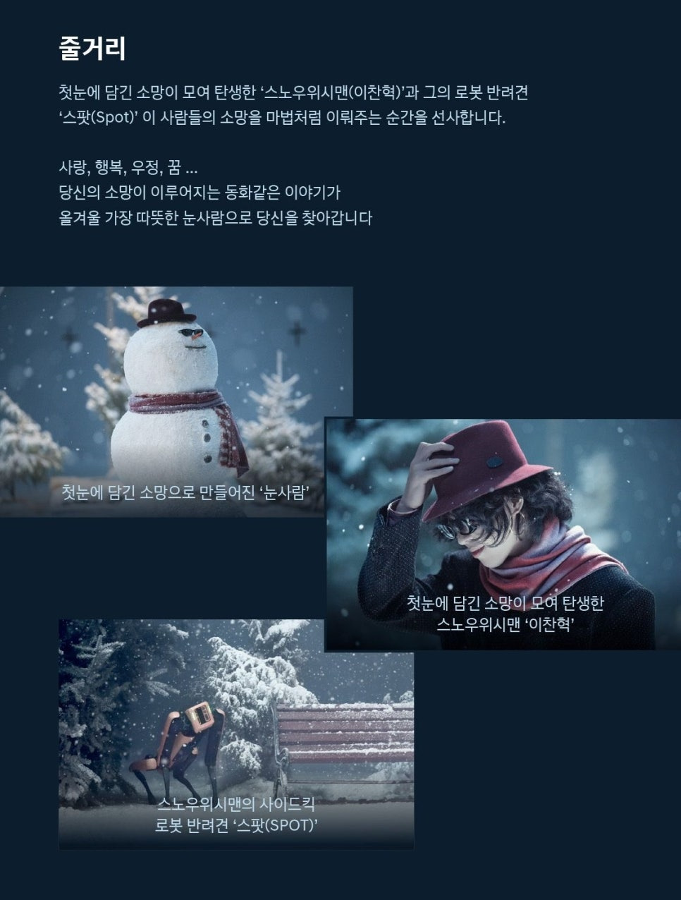 ‘더 스노우 위시맨’ 숏 무비는 눈 내리는 겨울 풍경 속에서 로봇 반려견 ‘스팟(Spot)’과 주인공 이찬혁 님이 함께 등장해, 소박하지만 진실된 소망들을 이야기합니다. 눈사람, 빛, 그리고 따뜻한 분위기가 어우러져 ‘소망이 우리를 앞으로 나아가게 한다’는 메시지를 전하고 있죠.