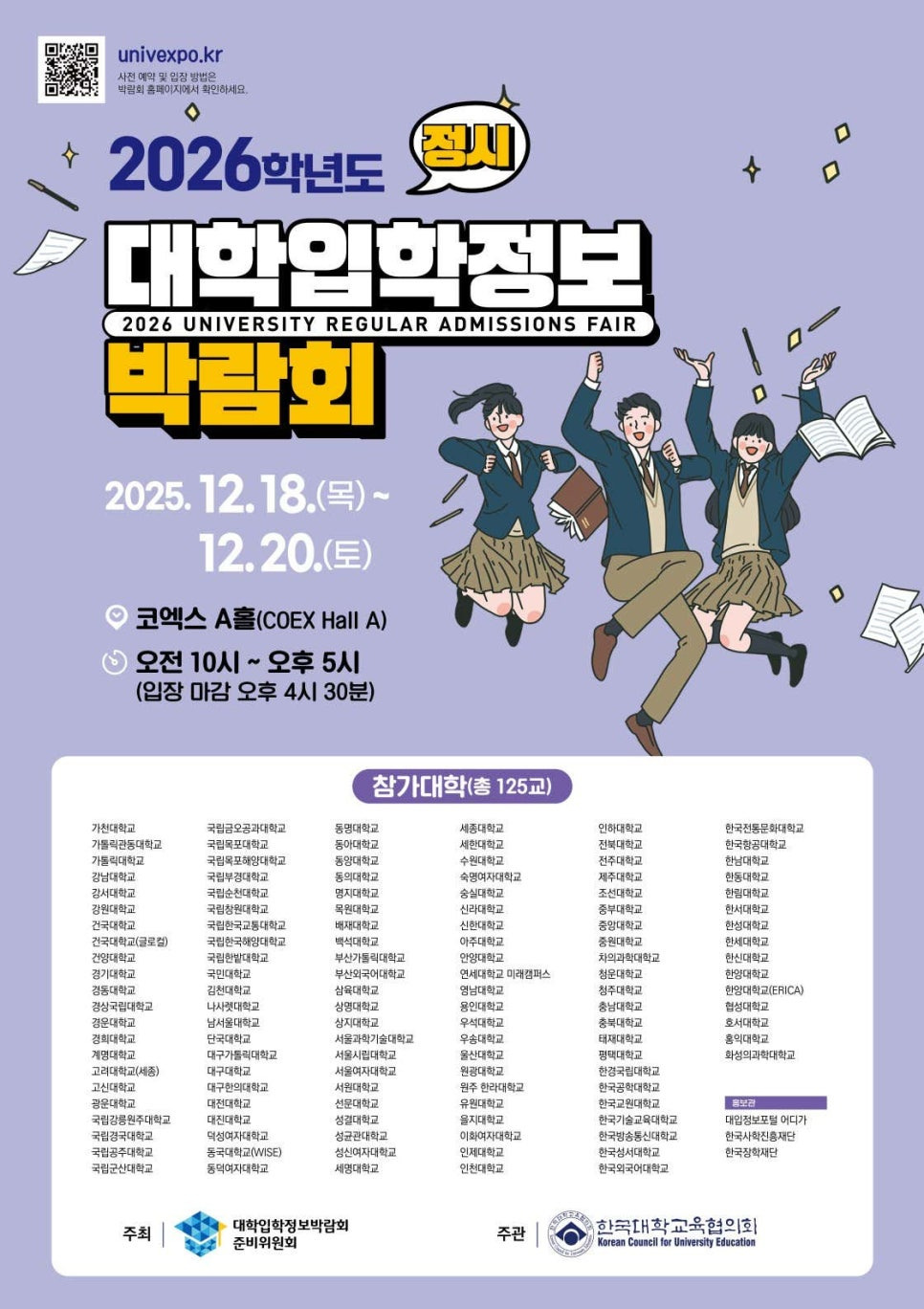 상위 리스트는 이번 2026학년도 정시 박람회(2025.12.18~12.20) 기준이며, 다가오는 2027학년도 수시(2026.07.23~25) 및 정시(2026.12.10~12) 박람회에도 대부분의 주요 대학이 참여할 예정이니 일정을 미리 체크해 두시기 바랍니다.