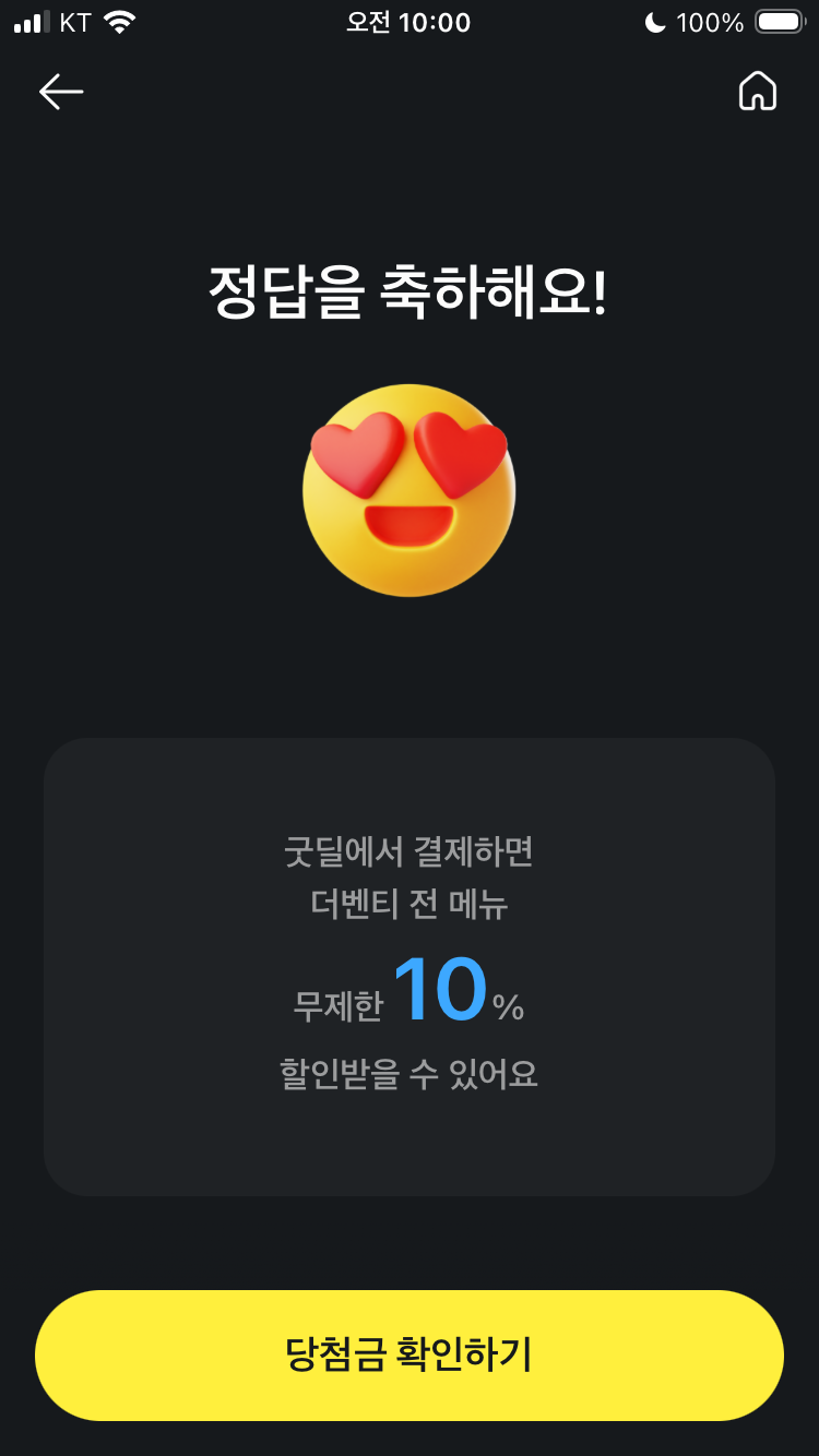 카카오페이 퀴즈 2월 18일 퀴즈타임 문제 정답 굿딜에서 결제하면 더벤티 전 메뉴 무제한 00% 할인받을 수 있어요
