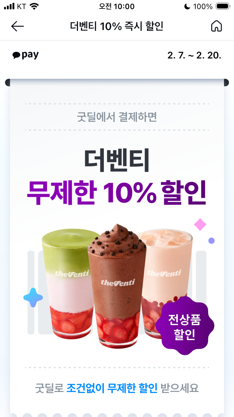 굿딜에서 결제하면 더벤티 전 메뉴 무제한 10% 할인