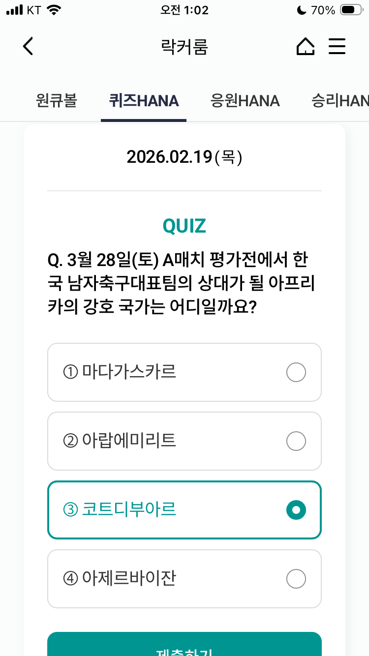 하나원큐퀴즈 2월 19일 축구 문제 정답 3월 28일 (토) A 매치 평가전에서 한국 남자축구대표팀의 상대가 될 아프리카의 강호는 어디일까요?