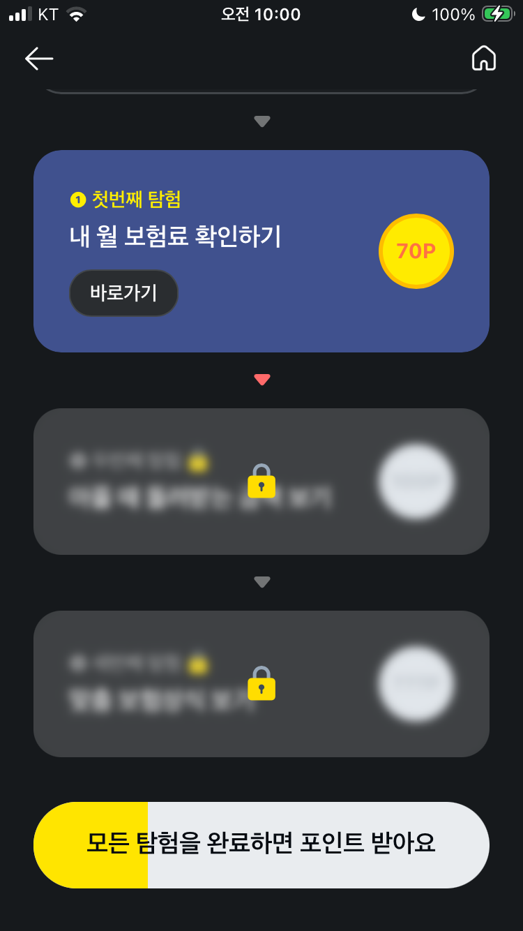 첫 번째 탐험을 마치면 순차적으로 다음 미션들이 활성화됩니다. 두 번째와 세 번째 탐험은 아직 자물쇠로 잠겨 있는데, 앞선 미션을 수행하면 자연스럽게 열리게 돼요. 각 단계마다 추가적인 포인트 혜택이 숨겨져 있으며, 모든 탐험을 완료하면 보너스 포인트까지 노려볼 수 있습니다. 평소 어렵게만 느껴졌던 보험 관리를 '탐험'이라는 컨셉으로 쉽고 재미있게 풀어낸 점이 인상적입니다. 차근차근 따라가다 보면 어느새 포인트가 쌓여 있을 거예요.