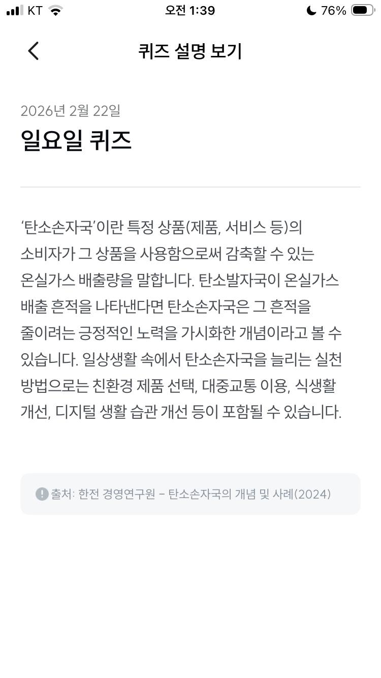 기후동행퀴즈 2월 22일 오늘의 기후행동 퀴즈 정답 문제 탄소손자국 뜻! 탄소손자국이란 탄소발자국의 반대 개념으로 온실가스 배출량을 감축하는 것을 말한다.