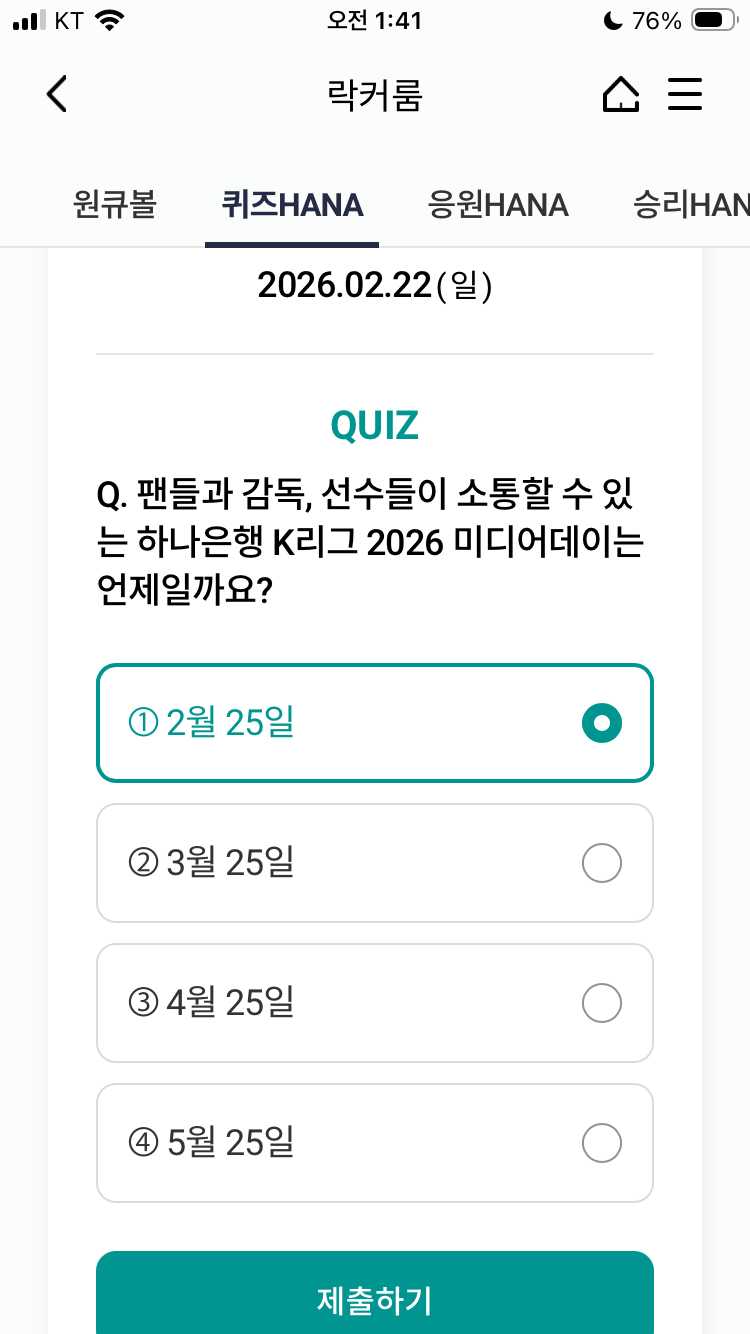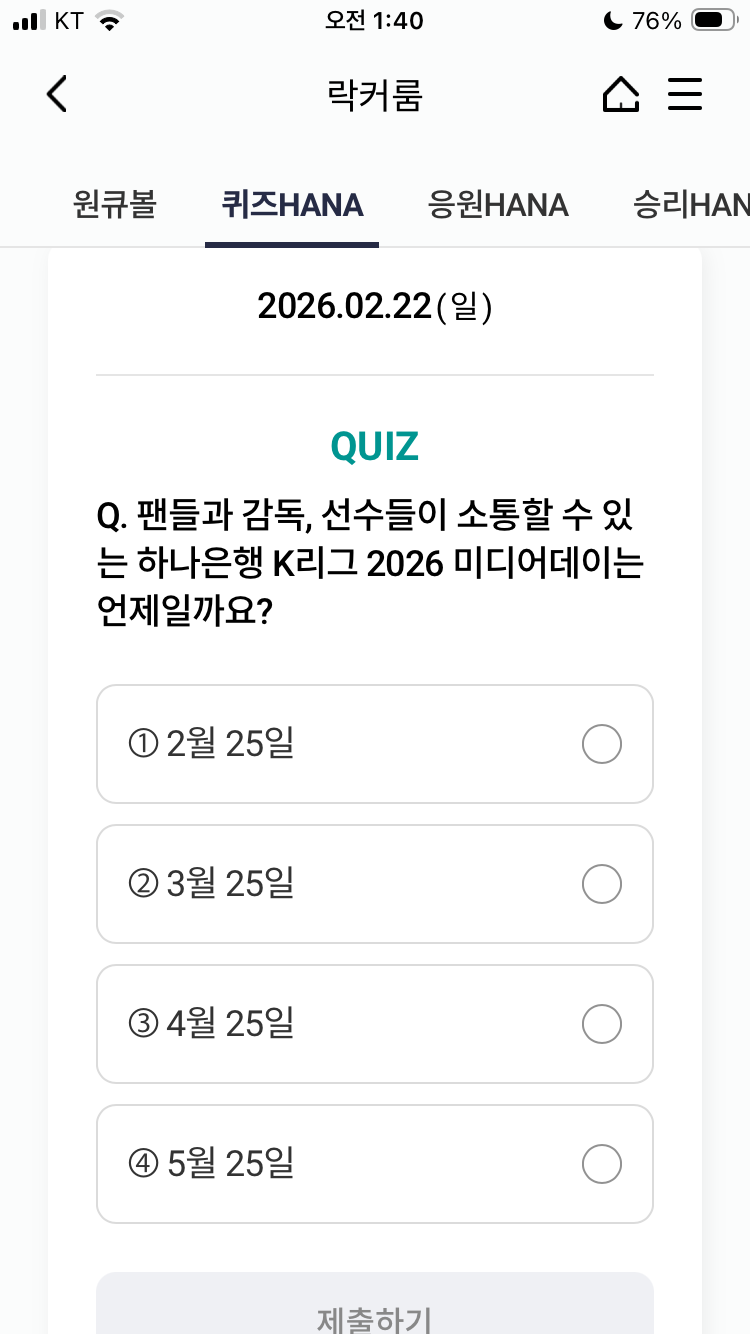 하나원큐퀴즈 2월 22일 축구 문제 정답 팬들과 감독, 선수들이 소통할 수 있는 하나은행 K리그 2026 미디어데이는 언제일까요?
