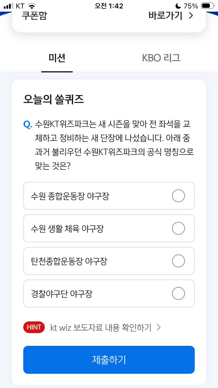 겨우 수원 종합운동장 야구장을 정답으로 선택하고