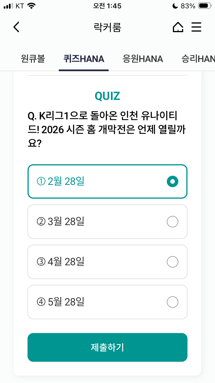 하나원큐퀴즈 2월 23일 축구 문제 정답 K리그1 으로 돌아온 인천 유나이티드! 2026 시즌 홈 개막전은 언제 열릴까요? (+ 2026 인천 경기일정, 홈경기 티켓 예매 안내)